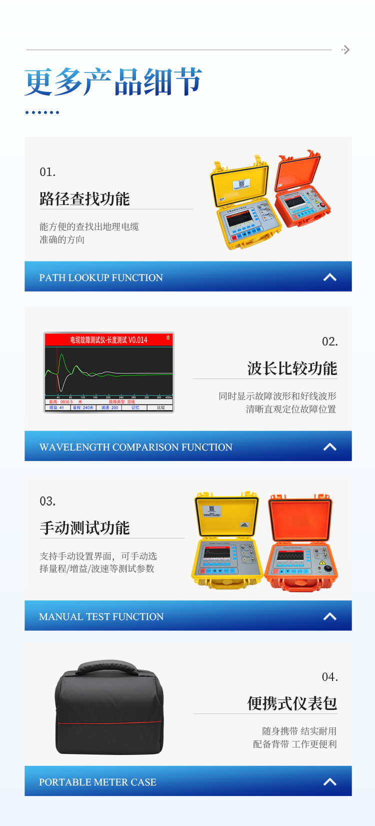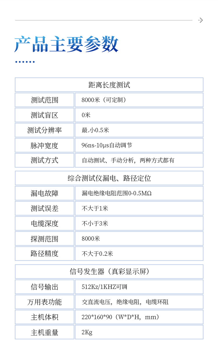 适用于路灯电缆维护、农田水浇地电缆故障查修、小区物业及园林绿化带地埋铠甲铁皮电力电缆、野外动力电缆、高速公路、厂矿企业、铁塔通信基站直埋供电电缆故障排查等行业。